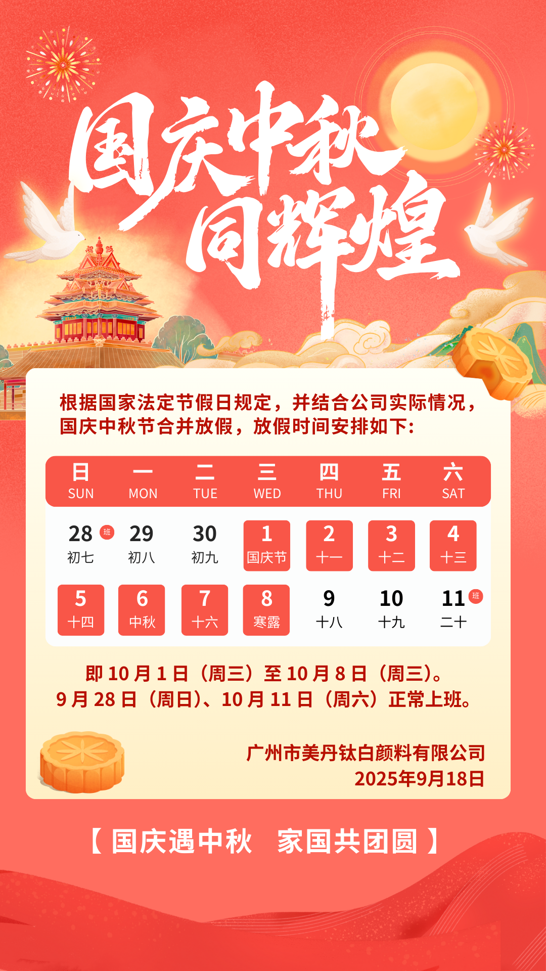 美丹颜料2025年国庆节、中秋节放假安排通知如下: