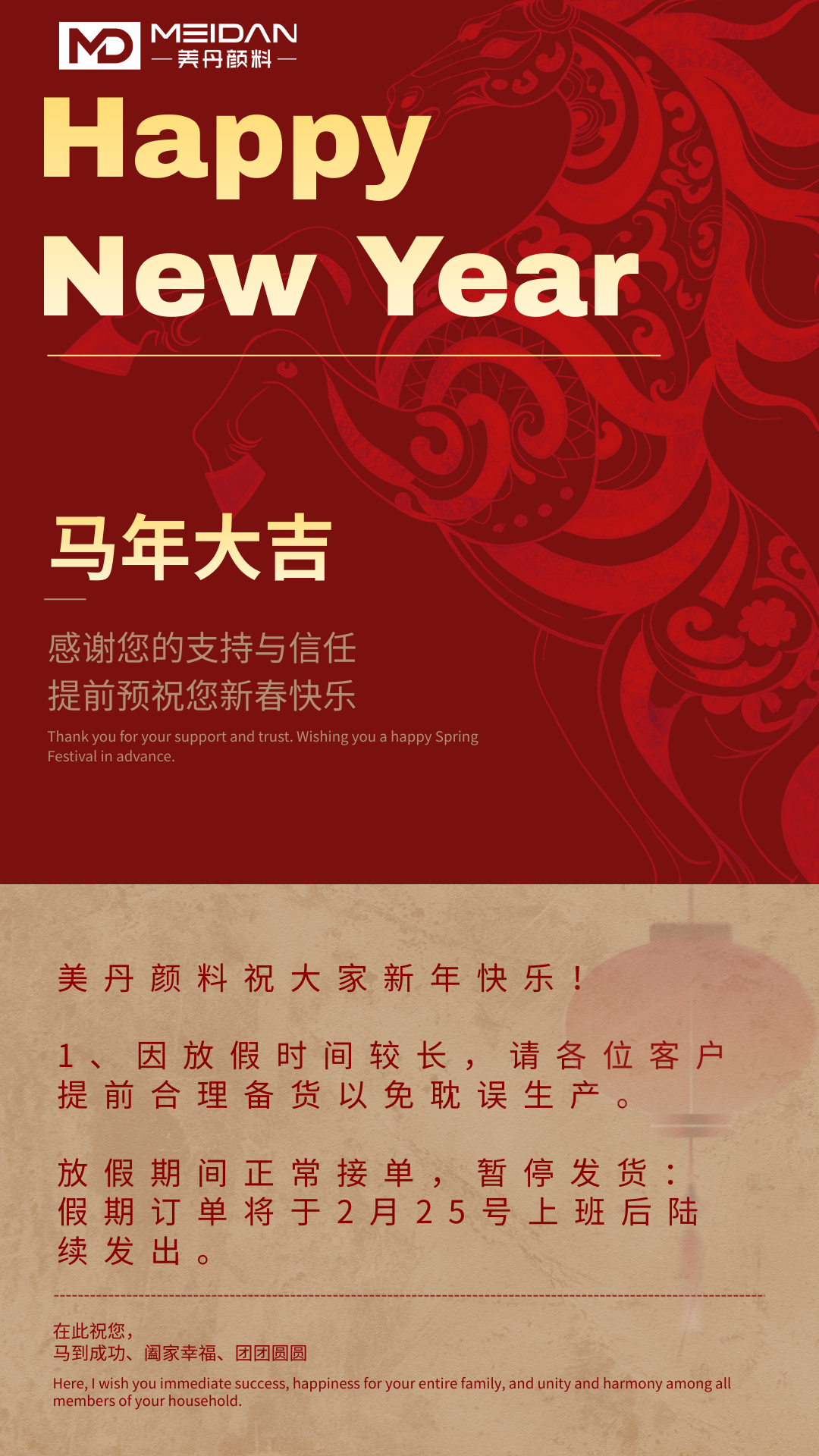 美丹颜料2026年春节放假安排通知如下: